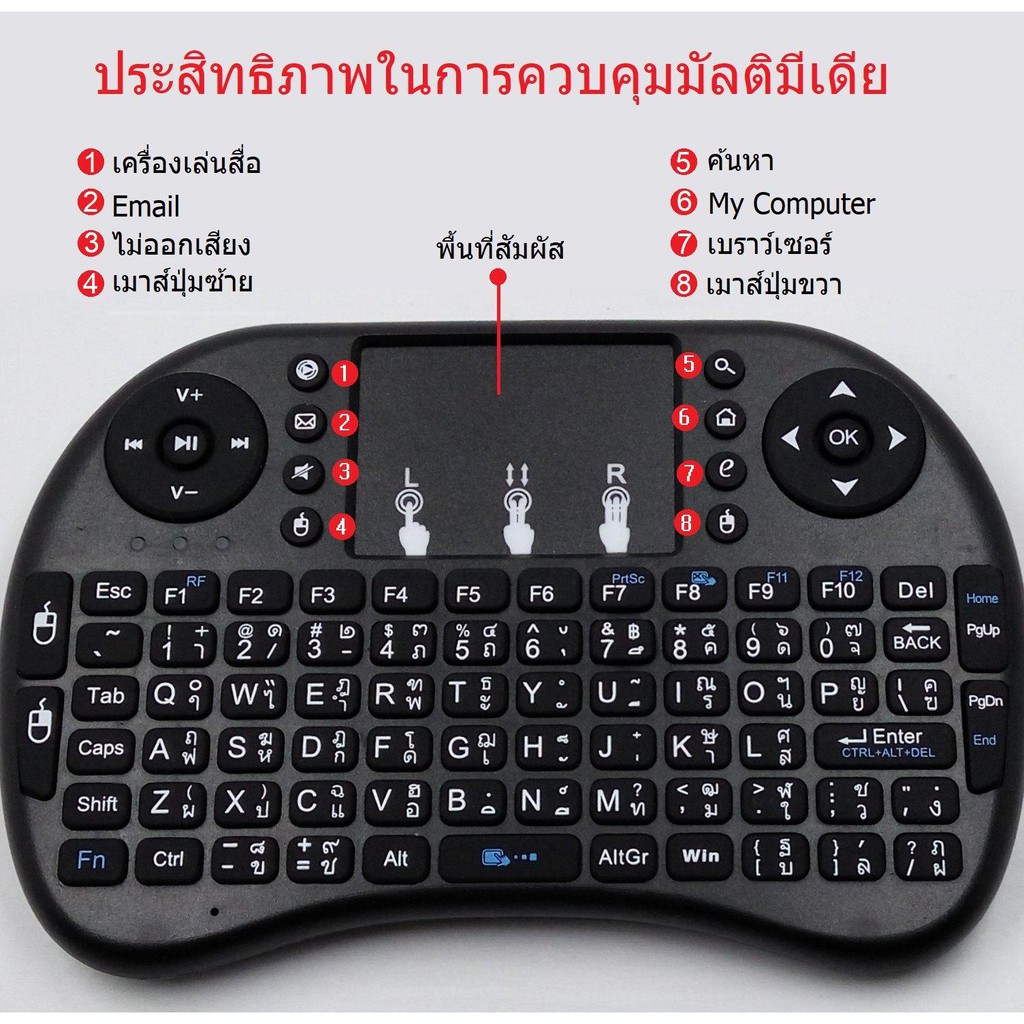 -i8 Mini Keyboard ใช้ง่าย แค่ใช้นิ้วสัมผัส Touchpad -แบบ LED ชาร์จไฟได้ใช้แบตเตอรี่ BL-5C ไม่สามารถใช้แบตเตอรี่ AA ได้ เปิดไฟ FN F2 -ถ้าลูกค้าซื้อไปเปลี่ยนภาษาไม่ได้กรุณาดูที่นี่ครับ https://m.youtube.com/watch?v=33MJ5Mypf2c -พิมพ์ภาษาอังกฤษ-ภาษาไทย มีทั้งคีย์บอร์ดและเมาส์ใช้งานได้พร้อมกันน้ำหนักเบาใช้งานง่ายสะดวกสบาย -ใช้งานได้คอมพิวพิวเตอร์และโน๊ตบุ๊กและใช้งานได้ร่วมกับ smart tv กล่องแอนดรอย ทุกรุ่น รายละเอียดสินค้า: โหมด -RF: 2.4GHz GFSK - แหล่งจ่ายไฟ: แบตเตอรี่ลิเธียมไอออนโพลิเมอร์ขนาด 300mAh แบบชาร์จไฟได้ - แรงดันไฟฟ้า: 3.7V - น้ำหนัก: 109 กรัม - ขนาด: 148 * 97 * 18.5 มม ไฮไลท์ 1. ยแบบ QWERTY คำสั่งผสมทัชแพดพร้อมอะแดปเตอร์อินเตอร์เฟส USB3 in 1 มัลติฟังก์ชั่น 2.4 กิกะเฮิร์ตซ์มินิคีย์บอร์ดไร้สา 2. คำสั่งผสมที่สมบูรณ์แบบ: คีย์ 92 คีย์บอร์ดไร้สาย QWERTY Keyboard Touchpad ที่รองรับฟังก์ชั่นหลายนิ้วคลิกเดียวเพียงนิ้วเดียวเป็นเมาส์ซ้ายฟังก์ชั่นคลิกสองนิ้วเป็นฟังก์ชั่นเมาส์ขวาลากสองนิ้วเป็นหน้าจอกลิ้ง 3. นี่คือคำสั่งผสมคีย์บอร์ด 2.4 กิกะเฮิร์ตซ์มินิไร้สายแบบ QWERTY และ TouchPad พร้อมตัวแปลงอินเตอร์เฟส USB 4. ทัชแพดสมาร์ทไวต่อแสงในตัวสูงพร้อมดีไซน์พลิก 360 องศา